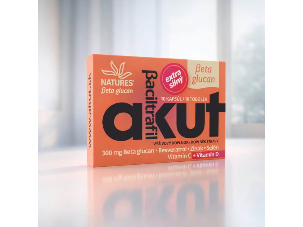 Účinné zložky výživového doplnku Baciltrafil AKUT sú ideálne pre výraznú podporu organizmu u všetkých, ktorí sa starajú o svoje zdravie. Sú vhodné pre ľudí, ktorí hľadajú synergické pôsobenie beta glukánu, resveratrolu a vitamínu C. V kombinácii so selénom a zinkom podporujú prirodzené obranné procesy organizmu a prispievajú k správnej funkcii imunitného systému. Účinné zložky výživového doplnku Baciltrafil AKUT prispievajú k správnemu fungovaniu imunitného systému aj počas náročných období. Beta glucan v kapsuliach je spracovaný patentovaným procesom extrakcie a purifikácie (čistenia). Navyše sú jeho častice upravované mikronizáciou, čo zaručuje vysokú čistotu a efektivituv obdobiach zvýšených nárokov na organizmus.
