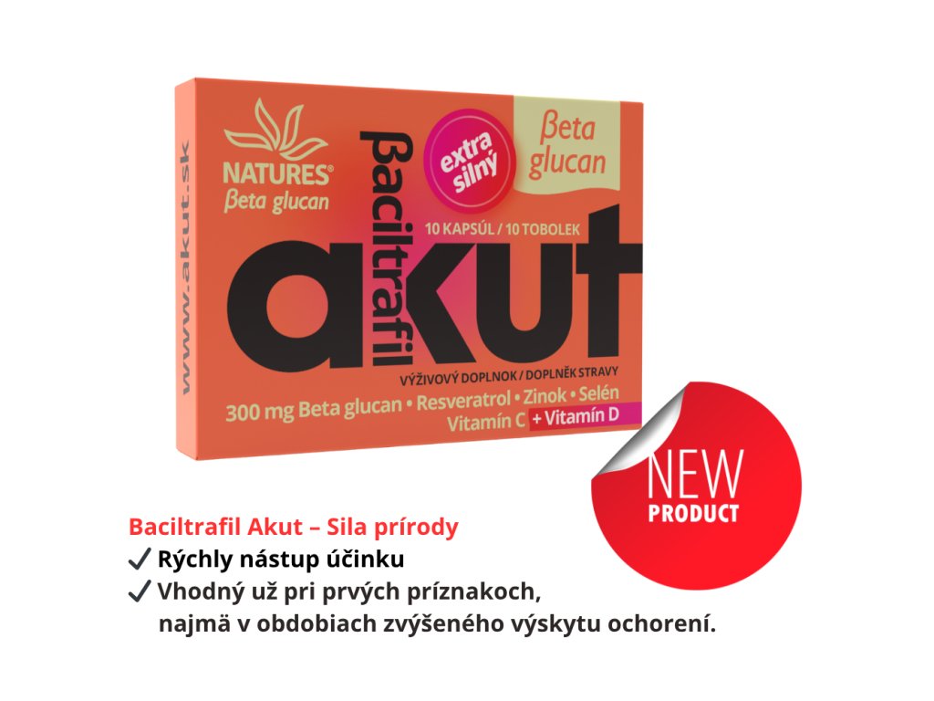 Účinné zložky: výživového doplnku Baciltrafil AKUT prispievajú nielen k správnemu fungovaniu imunitného systému, ale aj k ochrane buniek pred oxidačným stresom a celkovým preťažením. Beta glucan v kapsuliach je spracovaný patentovaným procesom extrakcie a purifikácie (čistenia). Navyše sú jeho častice upravované mikronizáciou, čo zaručuje vysokú čistotu a efektivitu v každom ročnom období.